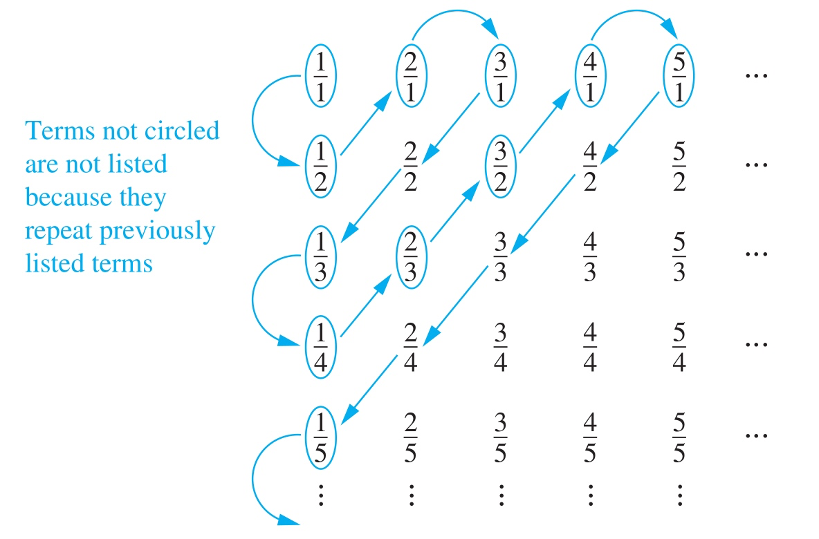 沿着途中箭头的方向,遍历有理数阵列,每个有理数的分子分母之和为k,在正整数集合M中必然有一个k与之对应,于是就建立了集合M和N之间的一一对应关系。
