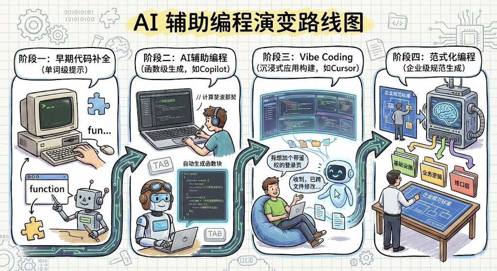 最早出现的是AI代码补全工具,将深度学习应用于代码补全,提供单词或单行级别的补全建议。后来以GitHub Copilot的出现为标志,AI编程助手可以根据注释生成整个函数,结合上下文推断开发者意图。这两年随着Vibe Coding的出现,开发者通过自然语言描述软件意图,由AI去完成具体实现,在一轮轮迭代对话中完成开发目标。